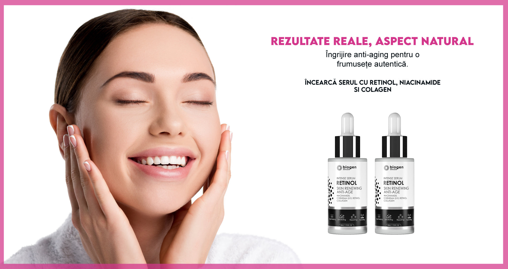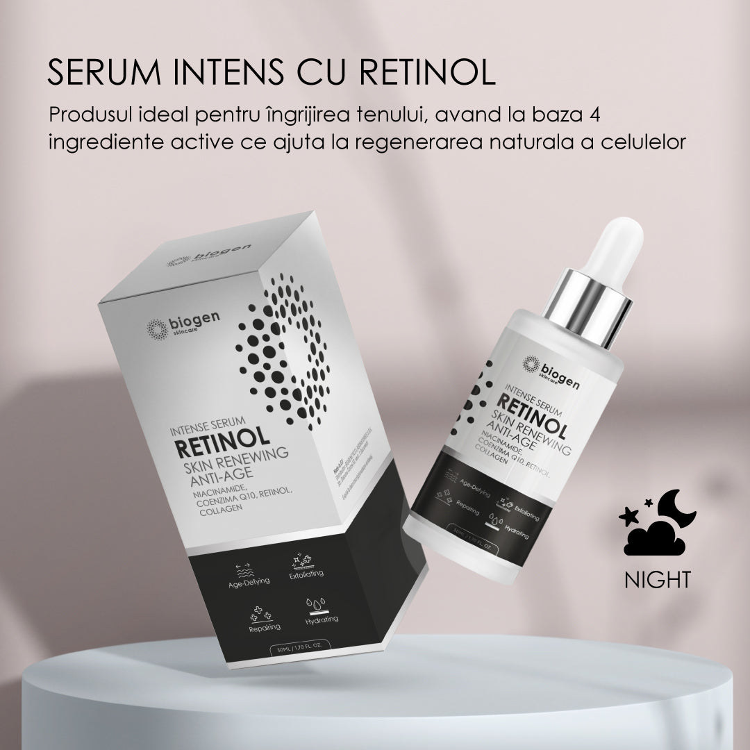 Retinol Intense Serum este produsul ideal pentru îngrijirea tenului, având la bază 4 ingrediente active ce promovează regenerarea naturală a celulelor pielii. Acest serum cu textură ușoară și mătăsoasă oferă un ten neted și o nuanță mult mai uniformă a pielii, formula sa îmbogățită cu retinol, niacinamide, coenzima Q10 si collgen ajutând la estomparea imperfecțiunilor, ridurilor și liniilor fine ale tenului. Cu peste 40 de ani de cercetare stabilită, retinolul s-a dovedit a avea beneficii uimitoare pentru piele și este renumit pentru capacitatea sa de a rafina și netezi suprafața pielii, de a îmbunătăți nuanța neuniformă a pielii și de a reduce aspectul liniilor fine, ridurilor și hiperpigmentării.
