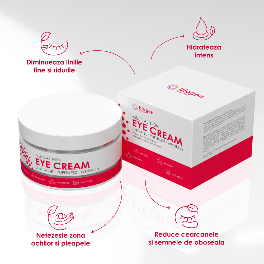 Crema de ochi de la Biogen Skincare oferă pielii un efect de lifting la suprafață, conturul ochilor devine mult mai neted, iar cearcănele și pungile sunt vizibil diminuate. Stimulează refacerea celulară și promovează umplerea ridurilor din interior datorită ingredientelor active din compoziția sa. Structura pielii se redensifică în profunzime, încetinind îmbătrânirea biologică a celulelor, ajută pielea să se mențină tânără pentru mai mult timp. Utilizarea continuă a cremei de ochi de la Biogen Skincare ajută la obținerea unui aspect întinerit al ochilor. În plus, formula sa luxuriantă și reconfortantă se absoarbe rapid, lăsând pielea fină și catifelată.